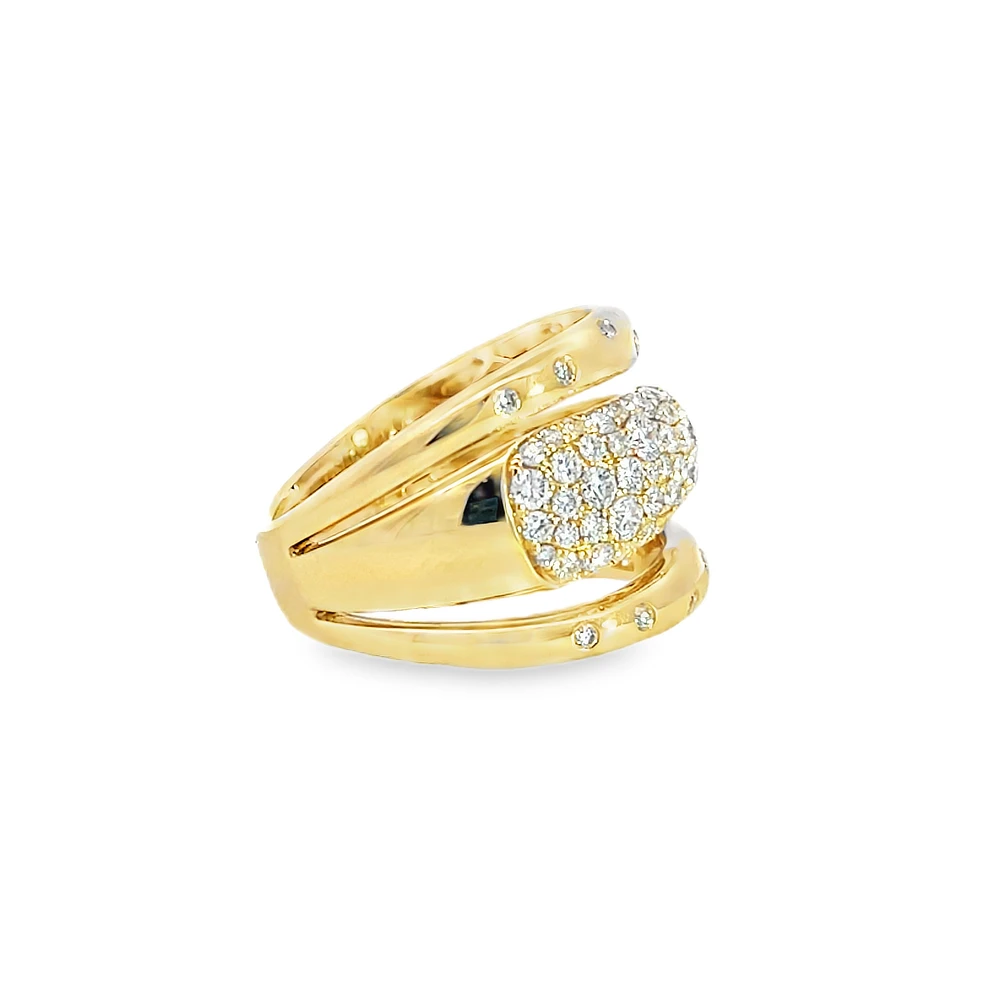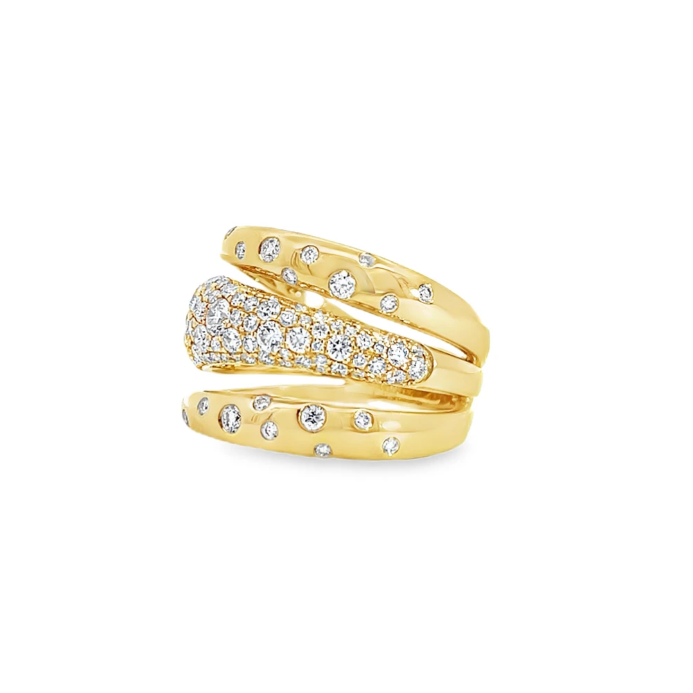 Be sure to make a bold statement with this lux triple band diamond set ring set with split detail contrasting highly polished hammer set shoulders that curve along a pave of brilliant cut diamonds.