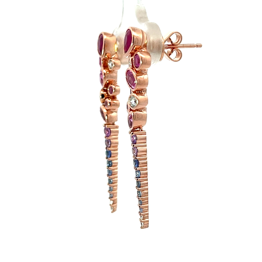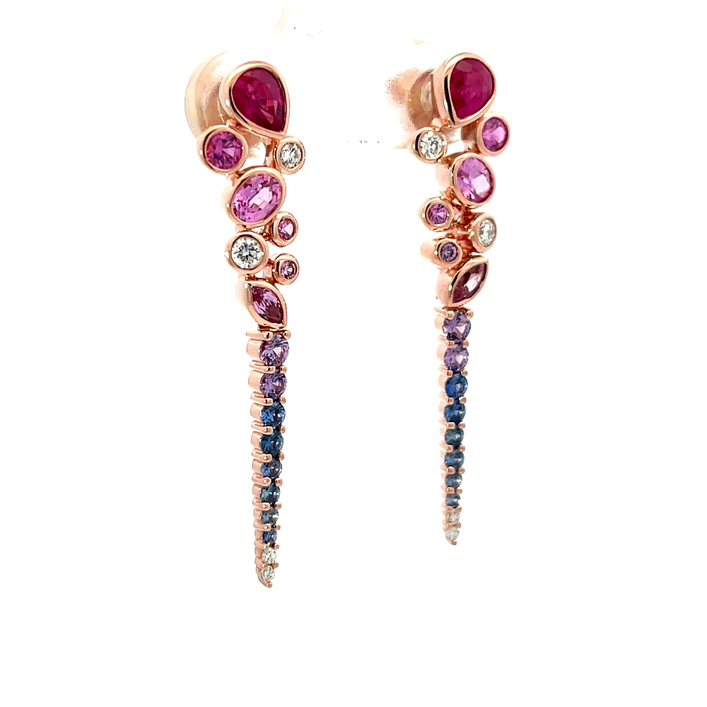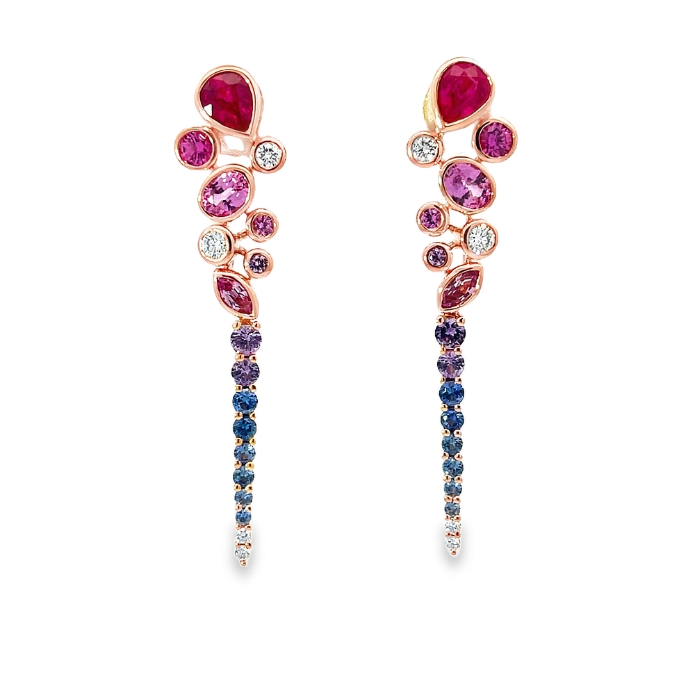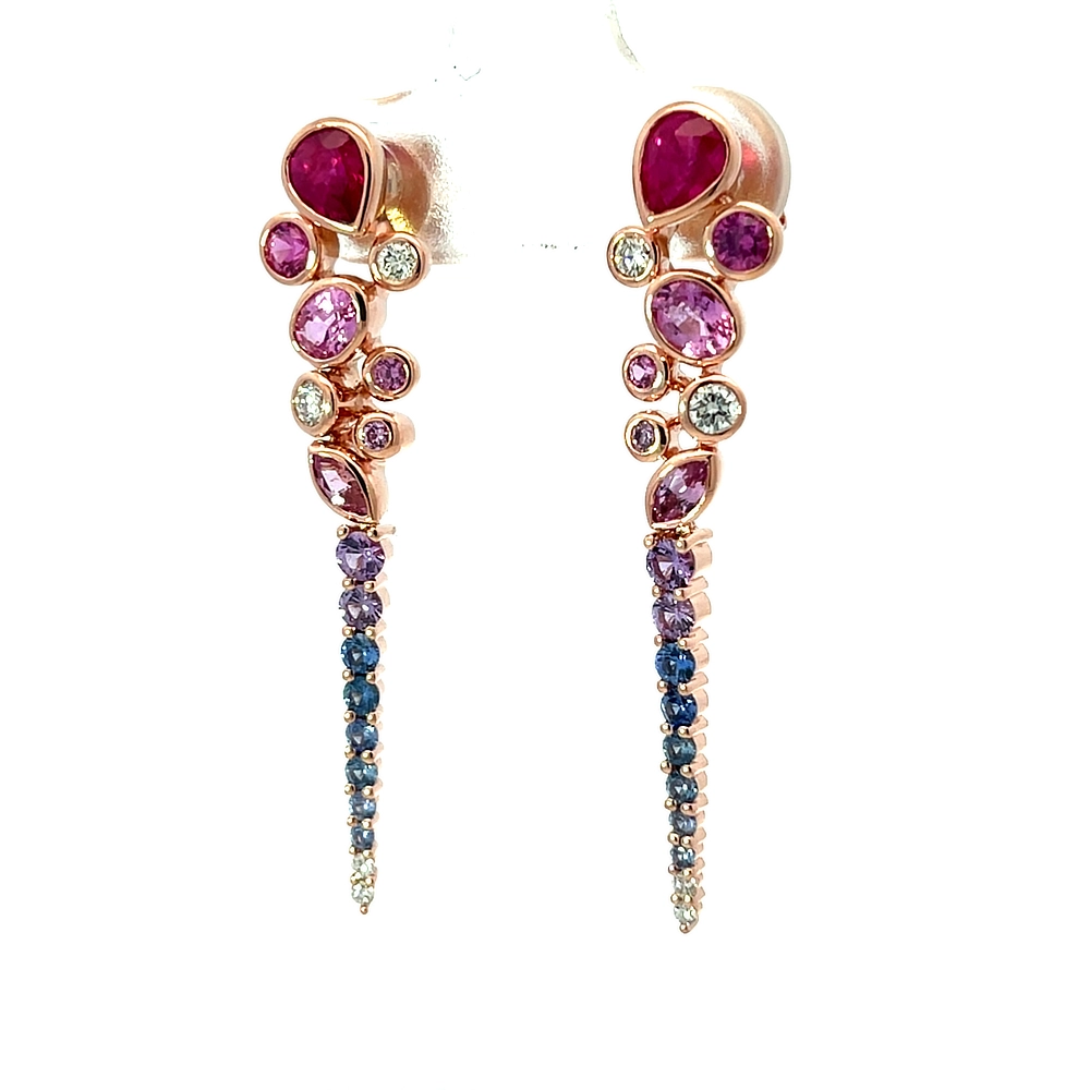 How special are these gorgeous earrings! With a scattered, offset of coloured gemstones trailing down in a beautiful graduation of colour and size these devine earrings are truly something exceptional. Beautifully crafted and such elegance, perfect to compliment and elevate any outfit.