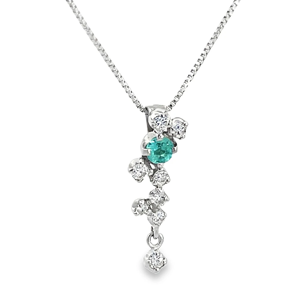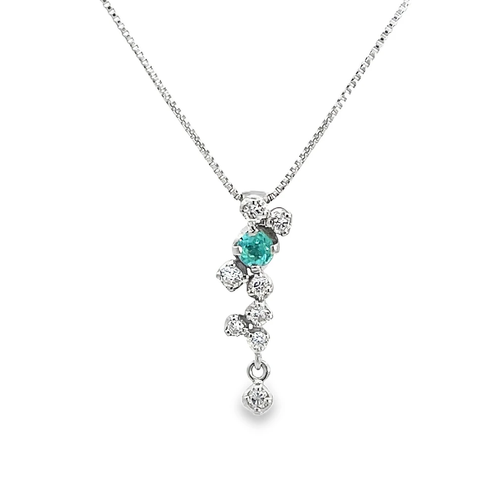 Diamond and Paraiba Tourmaline gently ramble down the neckline in a beautiful display of colour, brilliance and light.