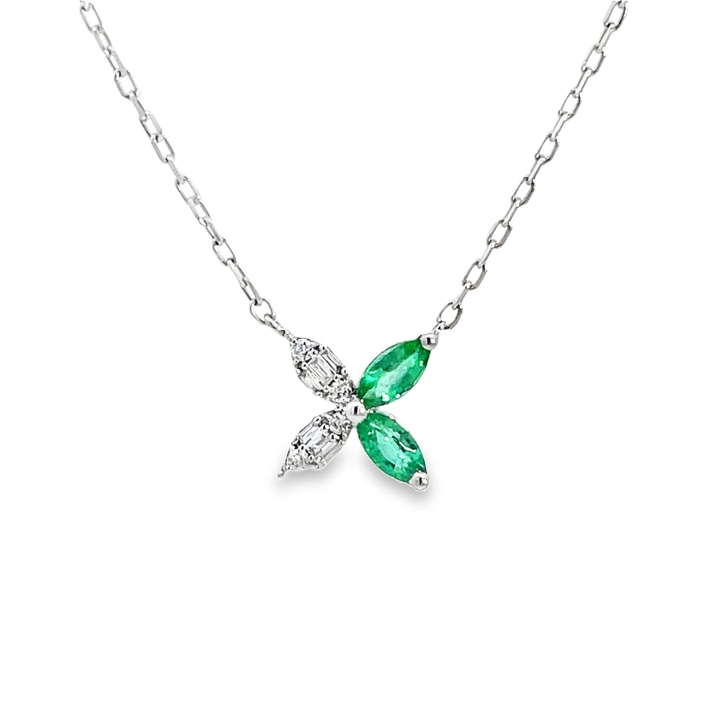 A pretty little pendant with the stylish combination of marquise emerald and diamond set in a contemporary design.