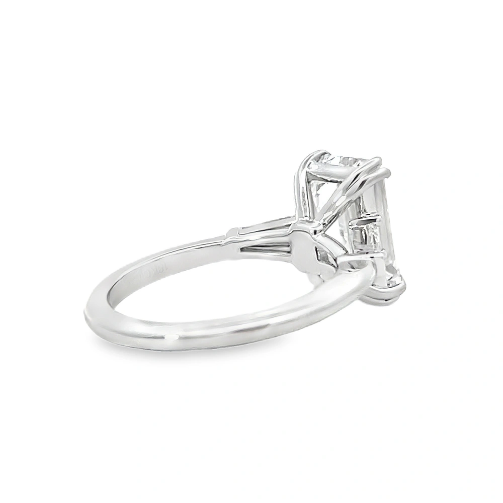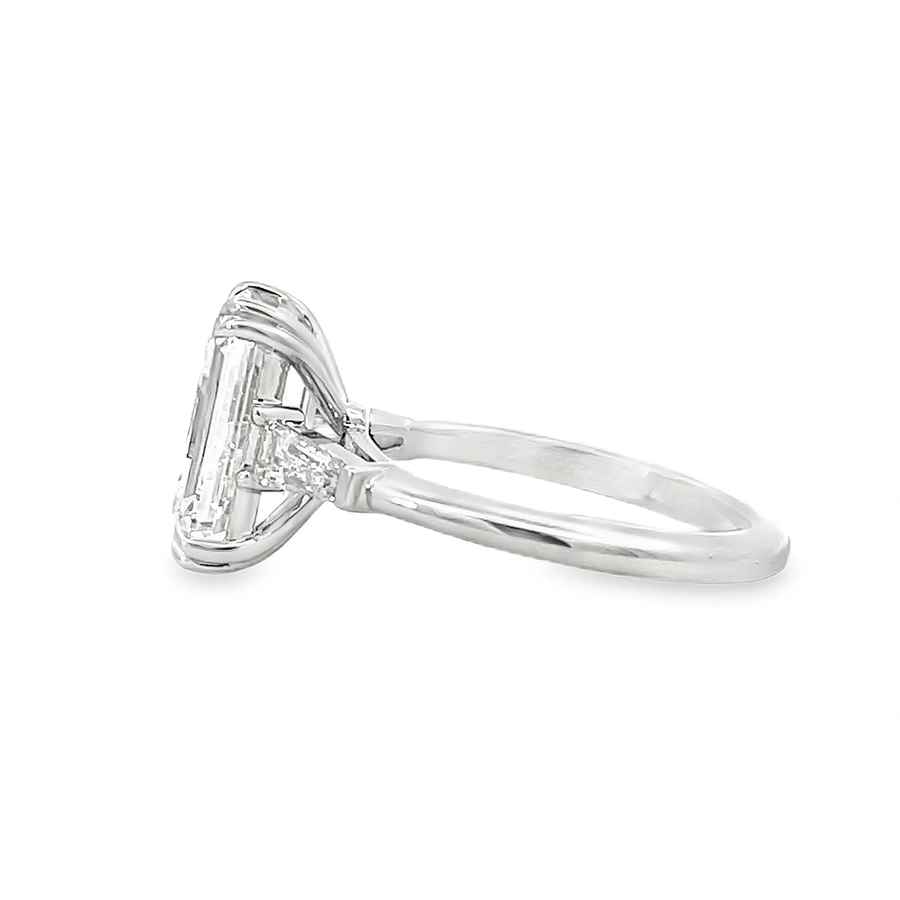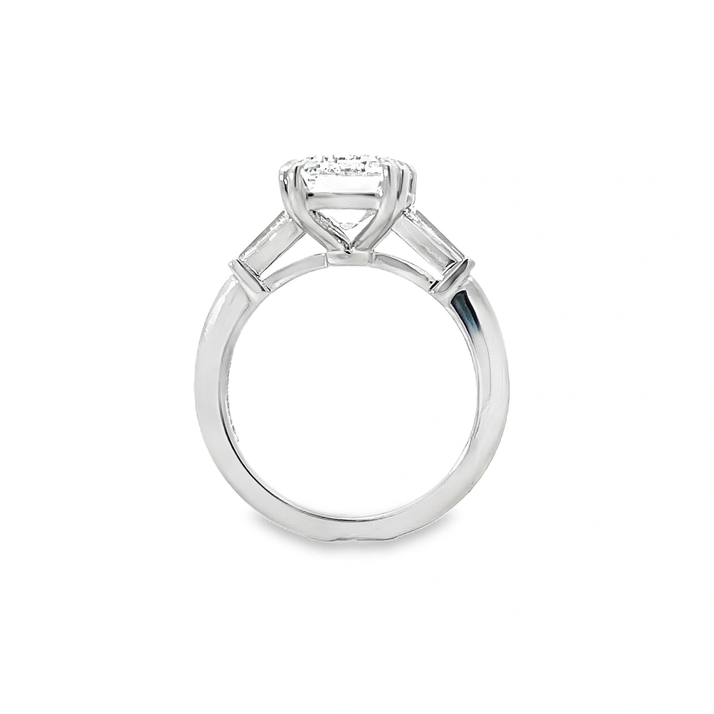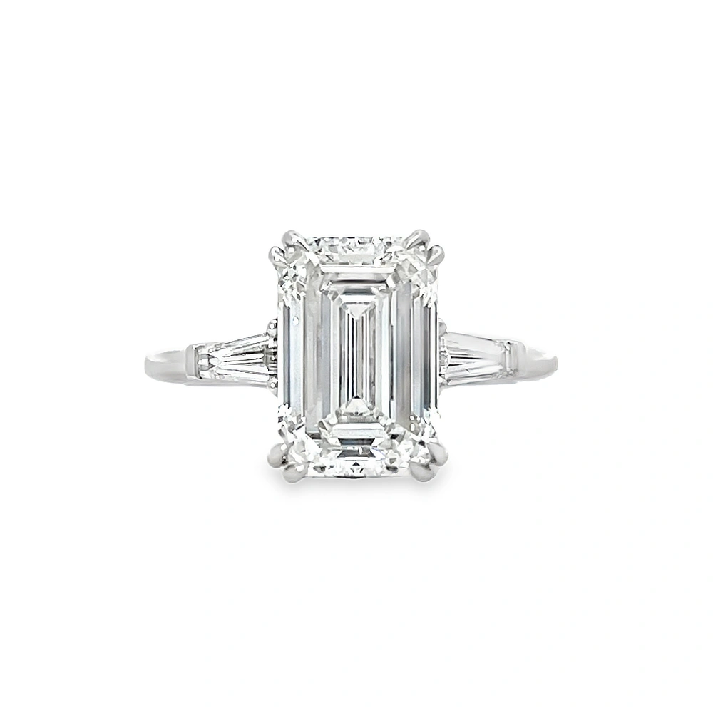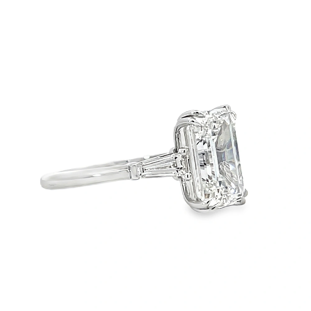A timeless classic, this devine four claw set 4.09ct emerald cut diamond sits at the centrepiece with refined, split claw detail while a beautiful tapered baguette diamonds sits on each shoulder.