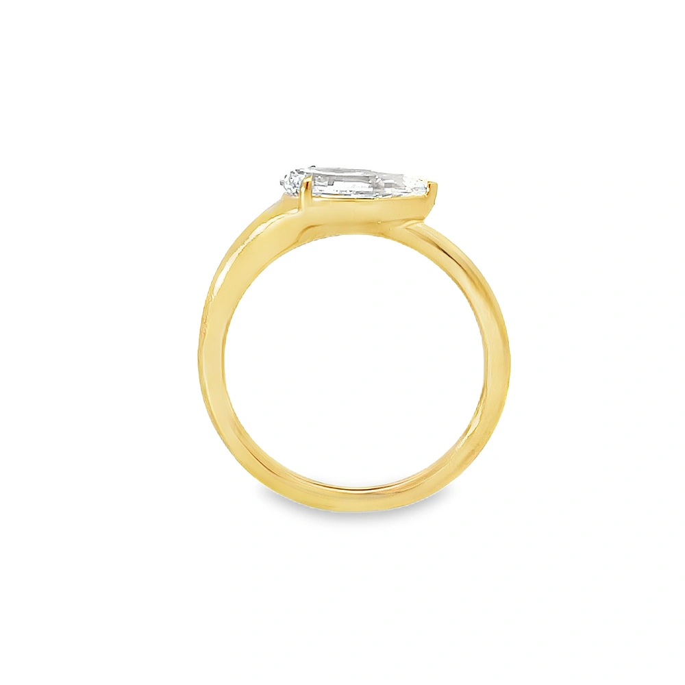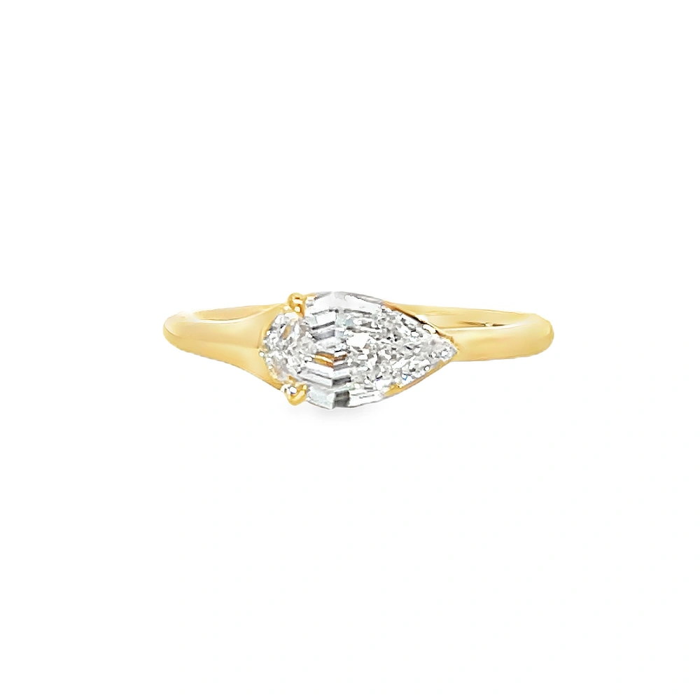 A striking and unique cut diamond sits as the centrepiece of this yellow gold diamond ring. This beautiful E colour Pear shaped diamond has been masterfully cut with a step design allowing the reflection of light to dance in a truly exceptional way.