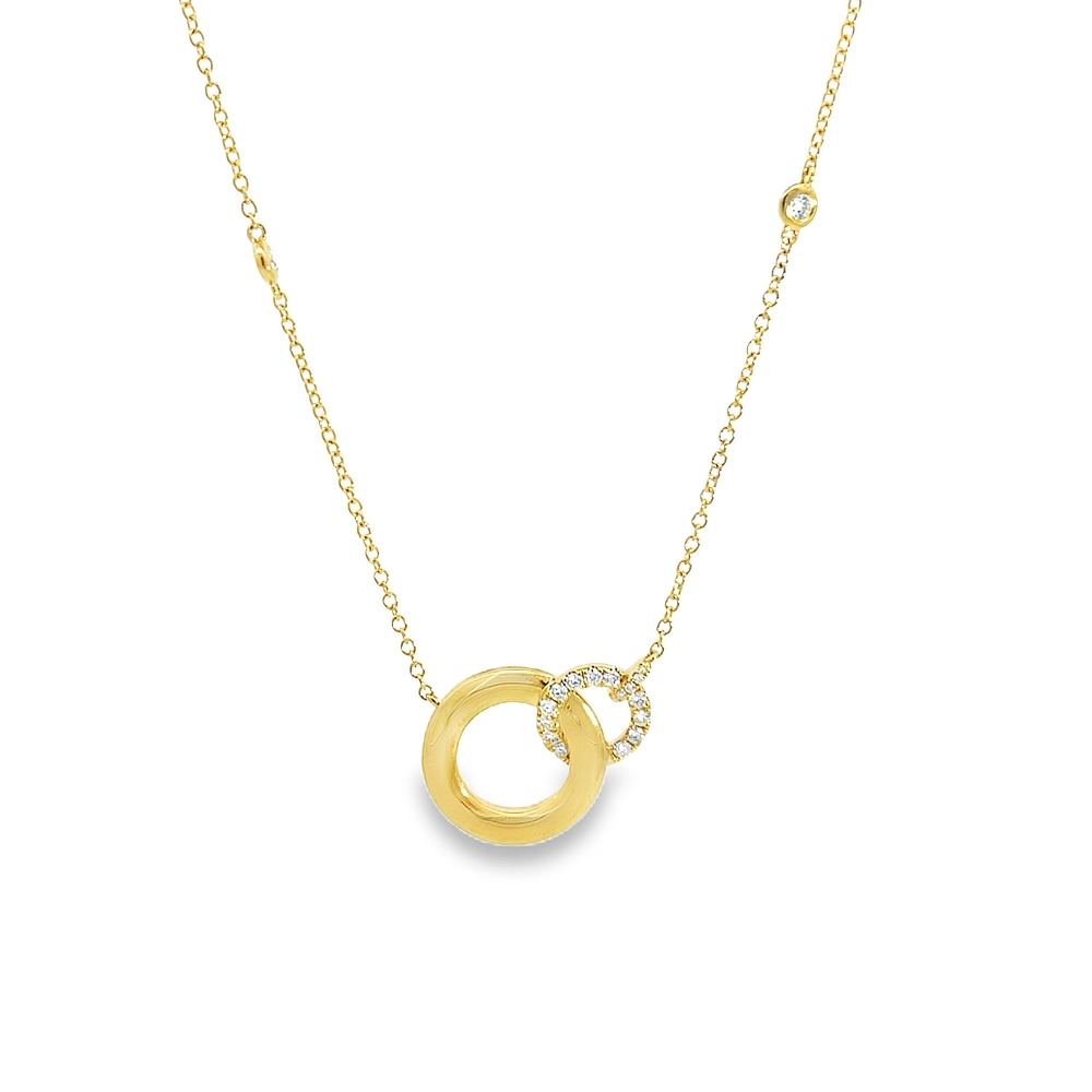 Starting with the delicate detail of a chain that is set with brilliant cut diamonds that are evenly spaced from the centre pendant that features 2 interlocking circles, one in highly polished 18ct yellow gold with its rich golden tone interwoven with a smaller pave diamond set circle.