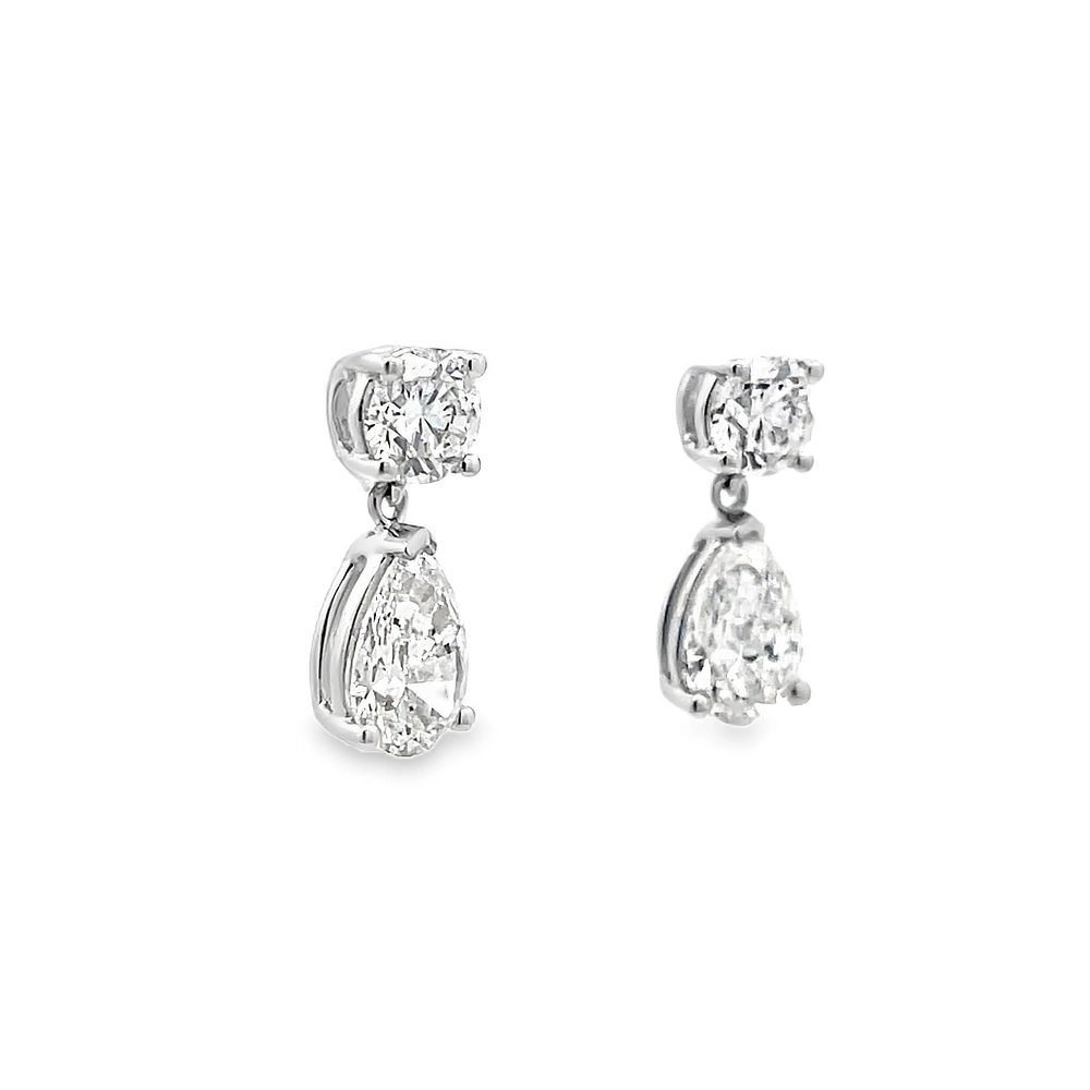 A half-carat brilliant cut diamond sits on the ear while a striking one-carat pear shape diamond is gracefully suspended from its base, radiating sparkle with every movement.