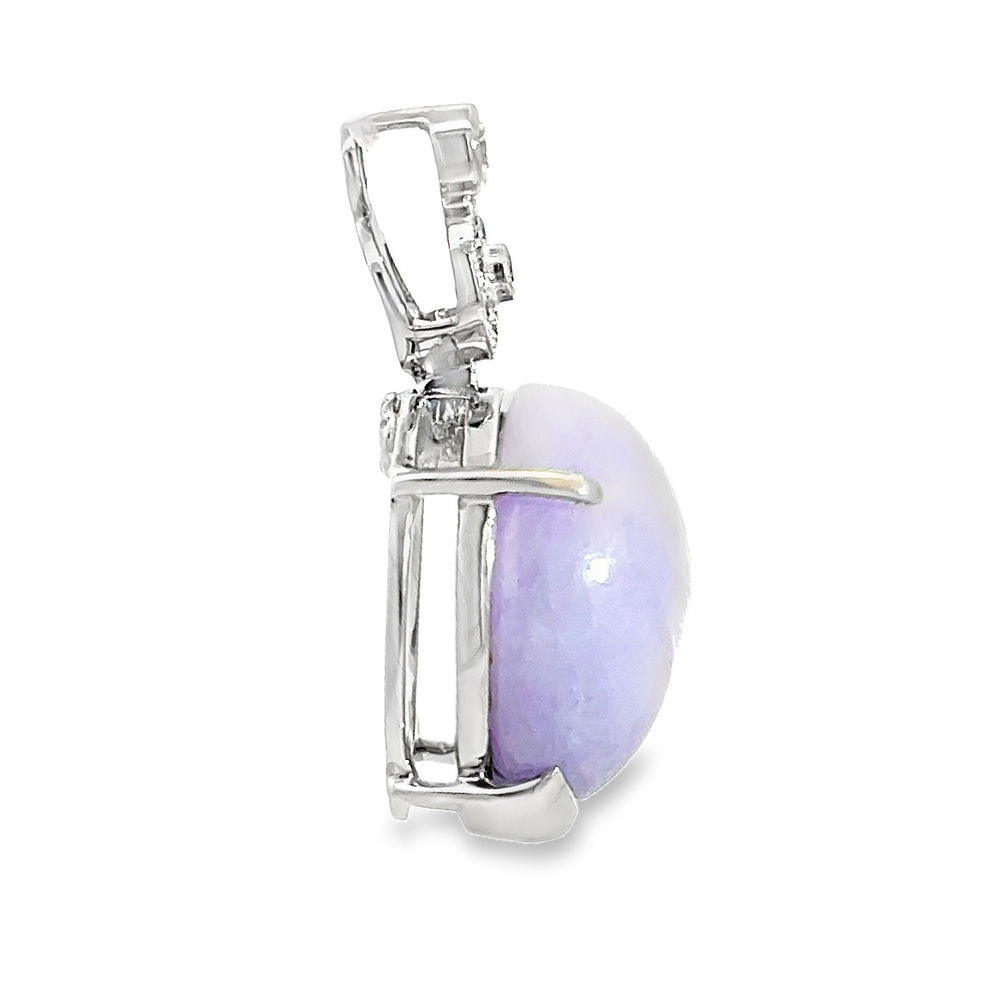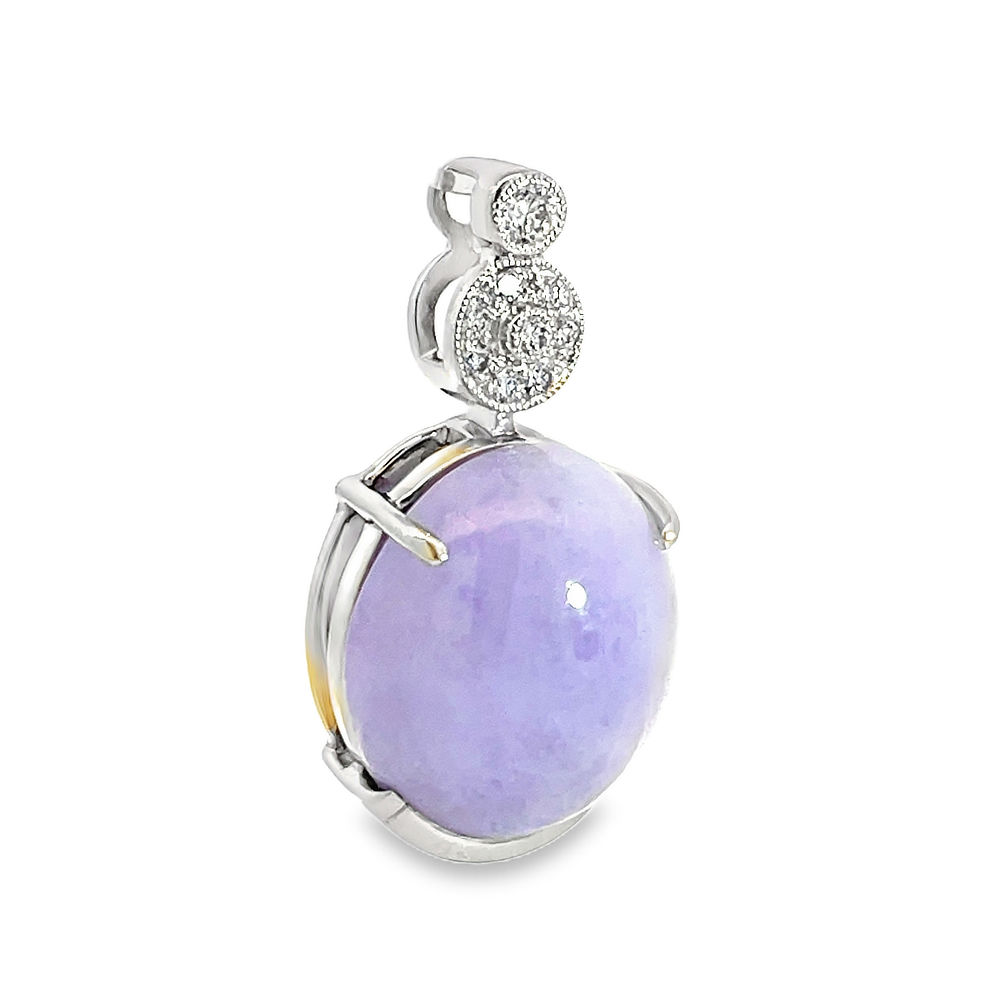 Soft lavender tones define this gorgeous gemstone making it highly sort after and this devine pendant with its delicate diamond detail showcases its beauty perfectly.