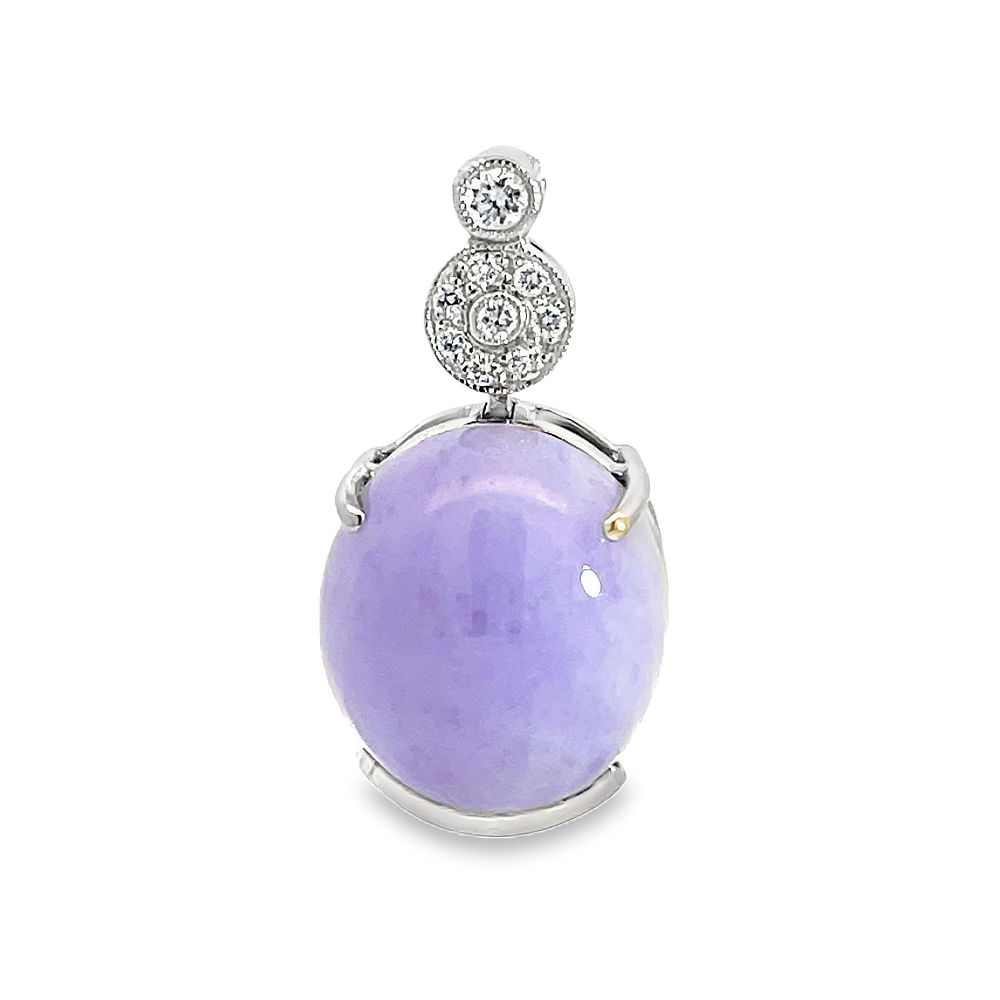 Cradled in platinum with a tier of diamond this beautiful lavender jade sits with striking simplicity.