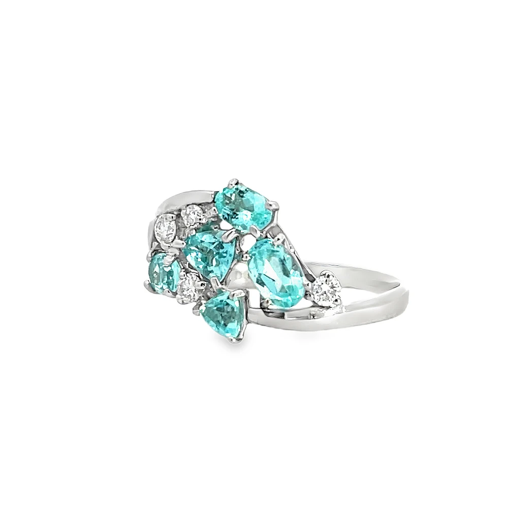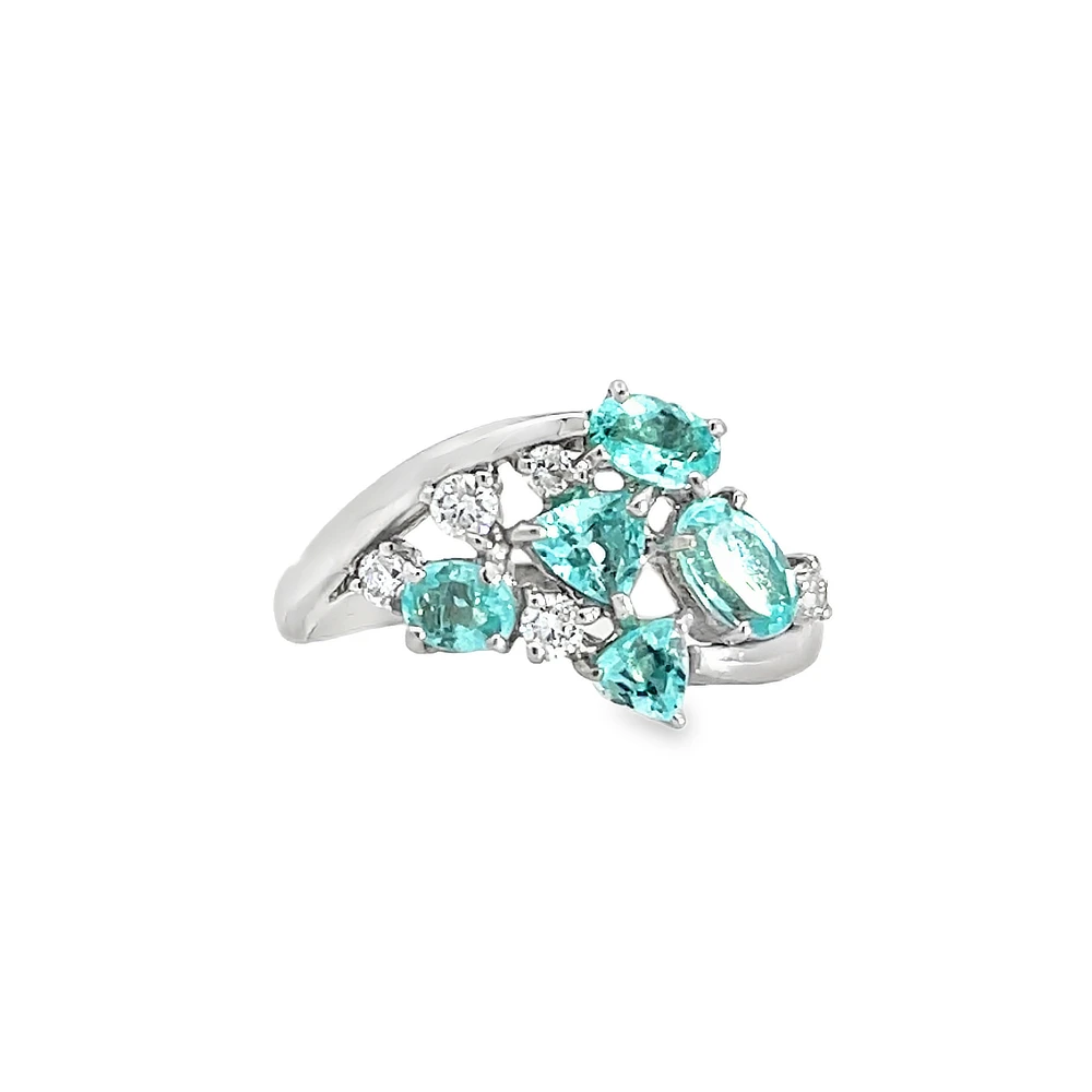 We love colour, we love working and creating beautiful pieces that captivate and intrigue with striking beauty and with a mosaic of rare Paraiba Tourmaline as the centrepiece, with its own unique, rare beauty, delicately scattered with brilliant cut diamonds, this gorgeous ring captures a luxurious artistry that we know you will love as much as we do!