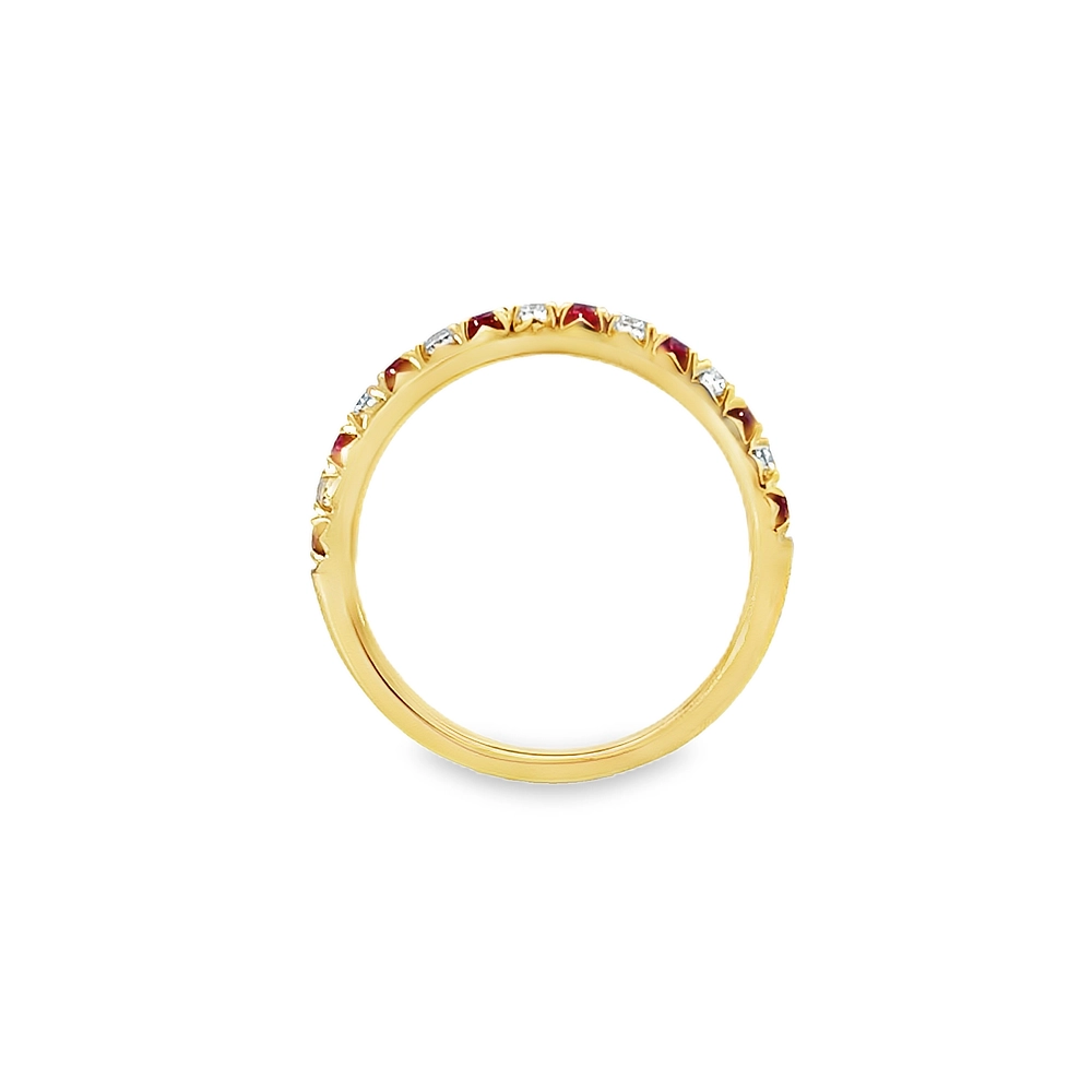 The luxurious colour combination of ruby and diamond is showcased beautifully in this very pretty eternity style band, designed with considered detail in 18ct yellow gold.